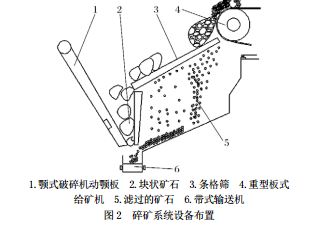 該礦碎礦系統(tǒng)工藝流程如圖1所示,設(shè)備布置如圖2所示,來料首先通過條格篩進(jìn)行篩選。
